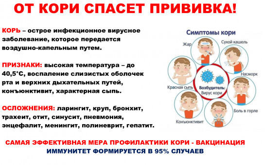 Корь очень заразна. Зачастую, источниками заражения становятся лица, посетившие «опасные» страны и, соответственно, лица, не прошедшие вакцинацию. В 90% случаев корь как лавина передается всем тем, кто контактировал с зараженным человеком. Главным источником заражения для населения являются мигранты из менее благополучных территорий (Украина, Таджикистан, Казахстан, Дагестан и прочих). Во многих субъектах РФ регистрируется корь, вначале как завозной случай, а далее уже местные, так как достаточно большое количество жителей не имеют прививок.