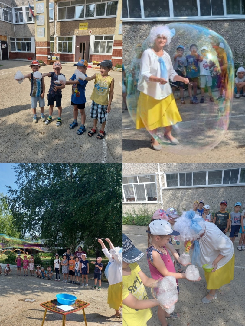 Клоунесса Шампунька провела соревнования с помощью коктейльных трубочек "У кого больше пенная башня". Превращала мыльные пузыри в воздушные шарики. И в завершении дети любовались на гигантские мыльные