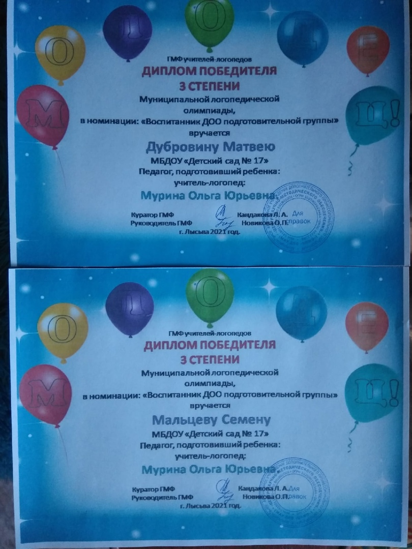 Подведены итоги муниципальной логопедической олимпиады в номинации "Воспитанники ДОО подготовительных групп". Наши дети заняли призовые места: