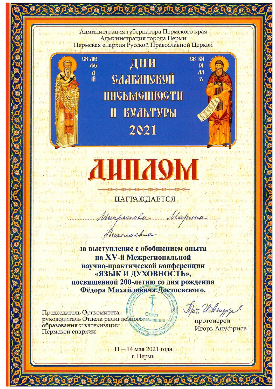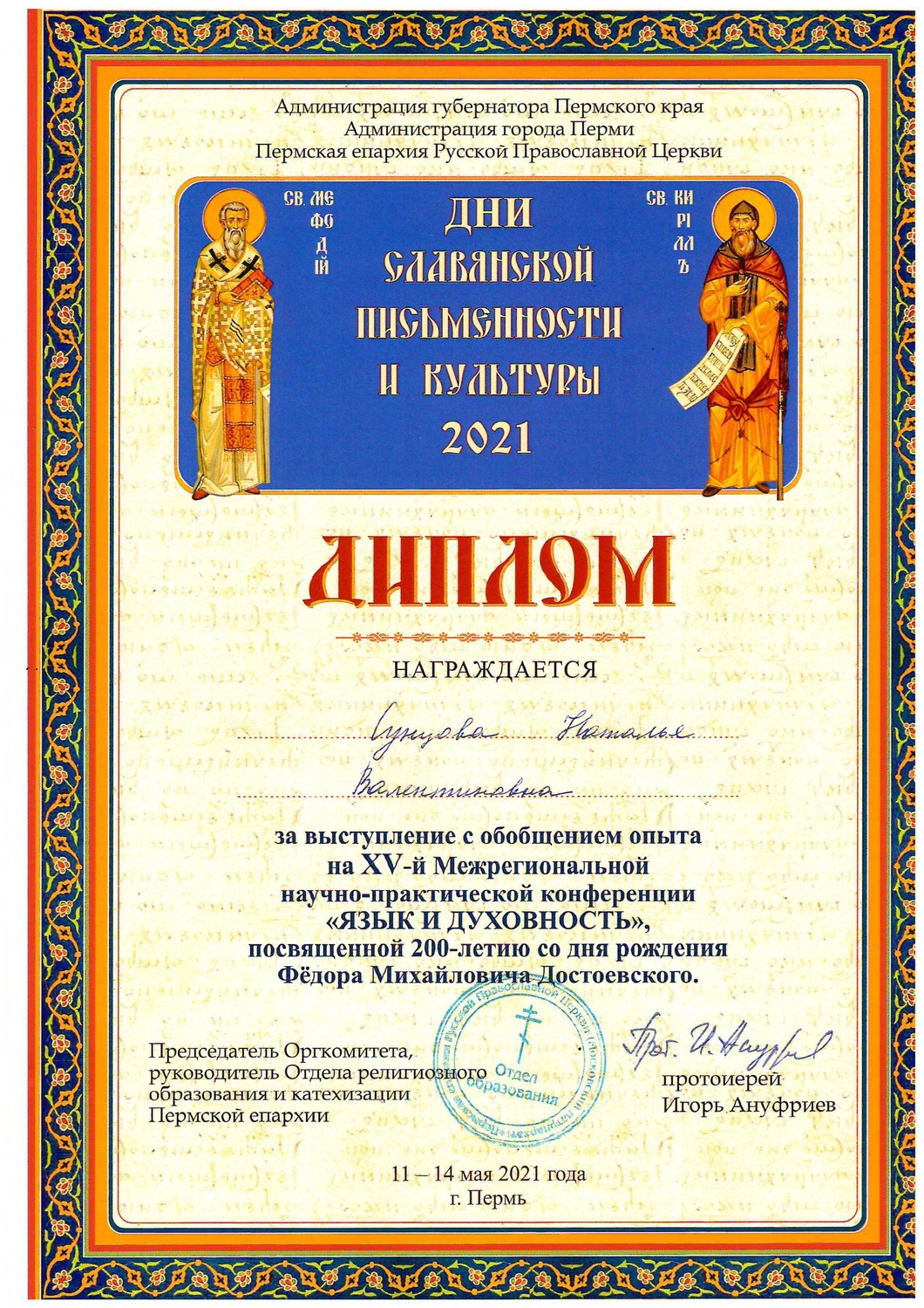 С 11-14 мая 2021 года в городе Перми состоялась 15-ая Межрегиональная научно-практическая конференция "Язык и духовность", посвященная 200---летию со дня рождения Ф.Н.Достоевского. На площадке "Особенности духовно-нравственного воспитания дошкольников" выступили с обобщением опыта работы "Духовно-нравственное воспитание детей старшего дошкольного возраста в условиях реализации ФГОС ДО в дошкольном учреждении" Микрюкова Марина Николаевна и Сунцова Наталья Валентиновна.