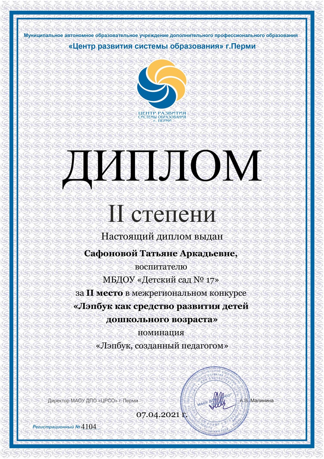 Дипломом 2-ой степени награждена Татьяна Аркадьевна Сафронова за лэпбук "Пожарная безопасность". Лэпбук, прошел апробацию в группе детского сада, дети с большим интересом проиграли. ПОЗДРАВЛЯЕМ Татьяну Аркадьевну!!! Желаем дальнейших побед!