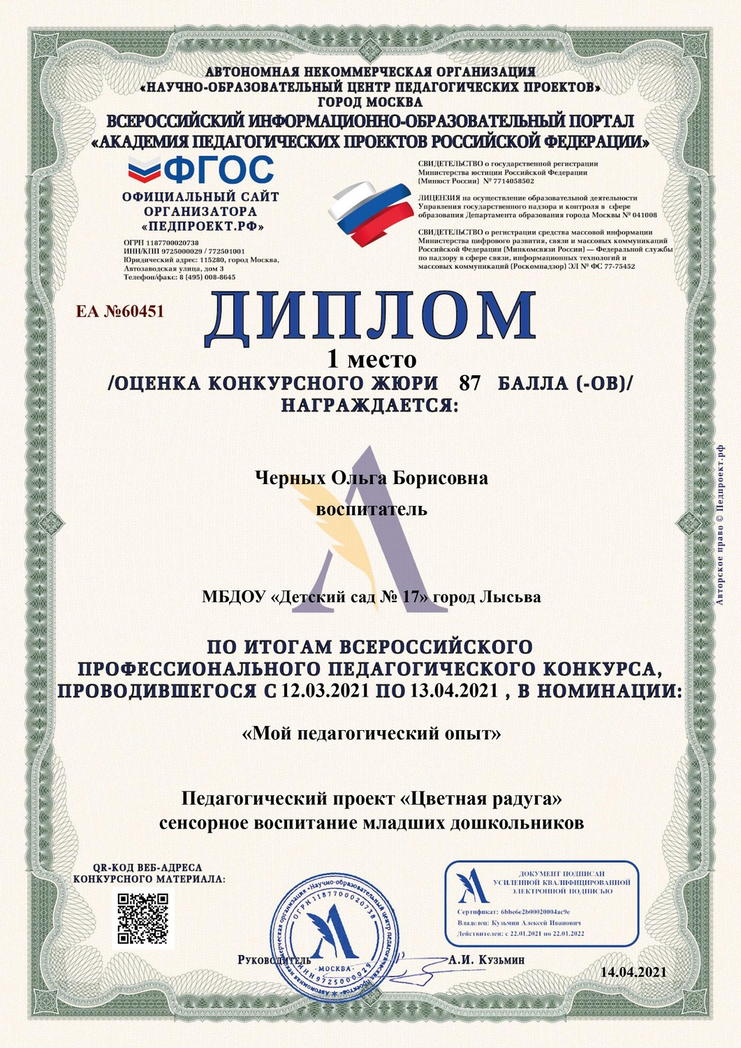Поздравляем Ольгу Борисовну Черных с 1-м местом во Всероссийском профессиональном педагогическом конкурсе в номинации "Мой педагогический проект". Ольга Борисовна представила педагогический проект "Цветная радуга" сенсорное воспитание младших дошкольников", который был успешно реализован в младшей группе детского сада.