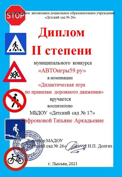 Завершился муниципальный конкурс "АВТОигры59.ру", организованный МАДОУ "Детский сад №26", итоги подведены. Поздравляем Татьяну Аркадьевну Сафронову с ПОБЕДОЙ в номинации "Дидактические игры по правилам дорожного движения".