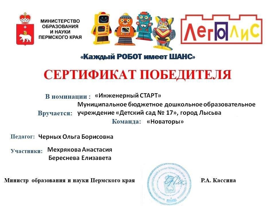 Команда "Новаторы" - Мехрякова Анастасия и Береснева Елизавета под руководством Черных Ольги Борисовны достойно представили свою работу "Робот помощник в детском саду" на V краевой выставке-конкурсе для детей дошкольного возраста "Каждый РОБОТ имеет ШАНС" в номинации "Инженерный старт".