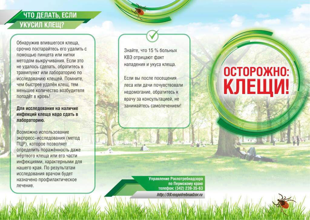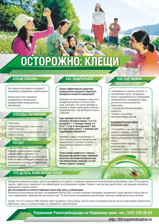 С наступлением весны и лета многие все чаще выходят в лес для отдыха. Именно в это время года в лесу таится опасность для здоровья и жизни человека, о которой многие не подозревают. Активный контакт жителей с природой обуславливает большую вероятность встречи в лесу с таежными клещами, являющимися хранителями и переносчиками вируса клещевого энцефалита и иксодовых клещевых боррелиозов (болезнь Лайма). Управление Роспотребнадзора по Пермскому краю информирует, что в Пермском крае эпидемиологическая ситуация по инфекциям, передающимся клещами, остается напряженной.