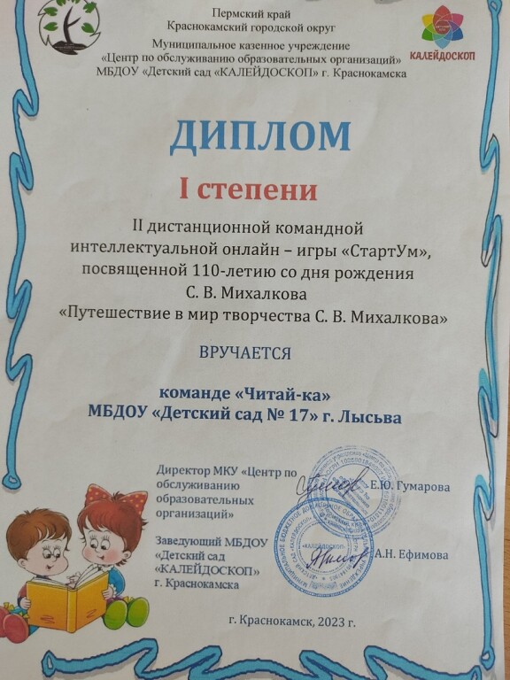 приняла участие во 2-ой дистанционной командной интеллектуальной онлайн-игре "СтартУм", посвященной 110-летию со дня рождения С.В.Михалкова "Путешествие в мир творчества С.В.Михалкова".
