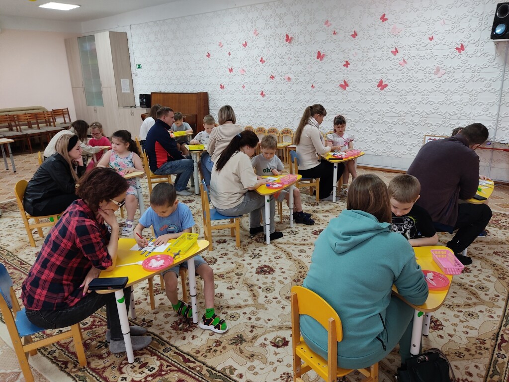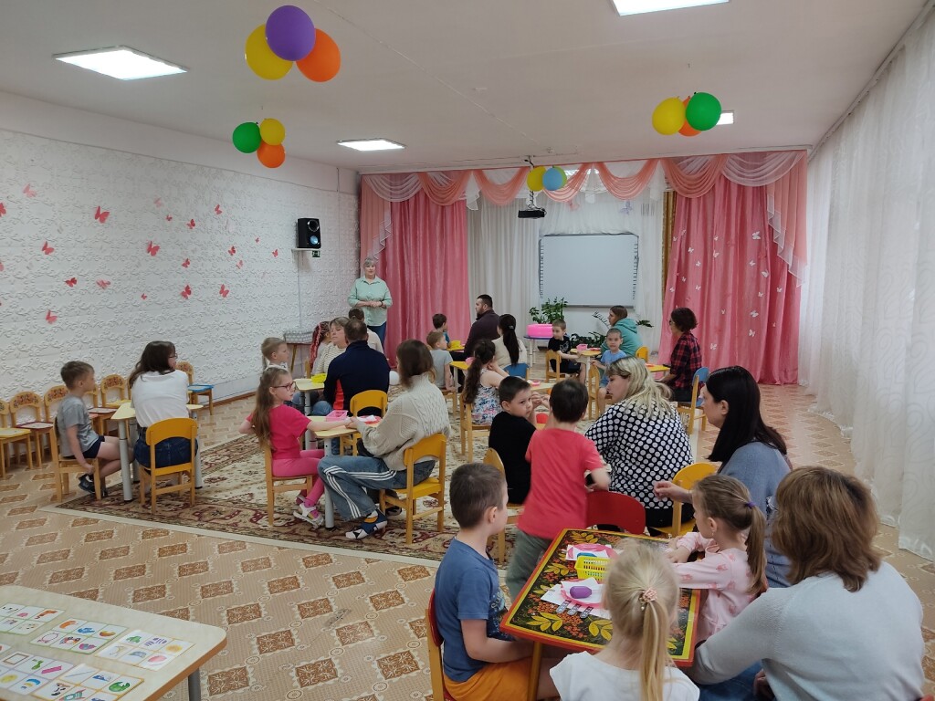 В детском саду в подготовительной группе прошла семейная гостиная в форме квест-игры "Путешествие по Грамоте", где дети вместе с родителями выполняли различные задания. Для выбора задания использовались разноцветные шарики, в них были спрятаны записки с названием задания, цвет выбирали родители, дети читали задание самостоятельно: