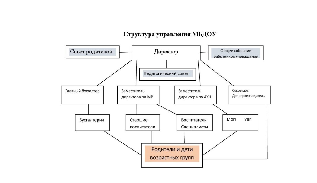 Непосредственное управление происходит на 1 уровне. Директор реализует управленческие решения через распределение обязанностей между административными работниками с учетом их подготовки, опыта, а так же структуры ДОУ.